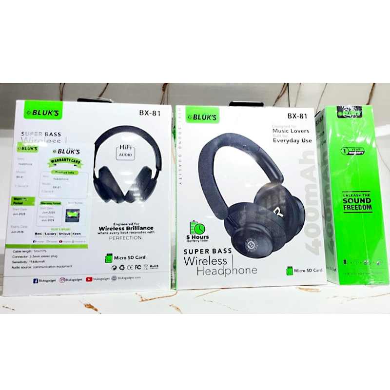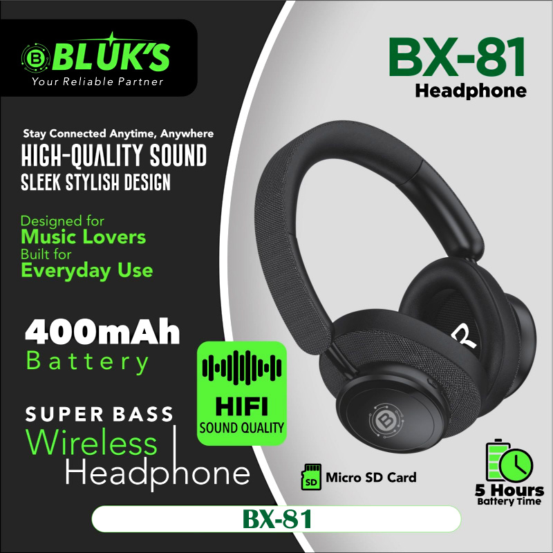 Step into immersive sound with the Bluk’s BX-81 Super Bass Wireless Headphones, expertly crafted for music lovers, gamers, and everyday users. Powered by precision-tuned 40mm dynamic drivers, the BX-81 delivers deep, punchy bass, balanced mids, and crisp highs for a powerful Hi-Fi listening experience.