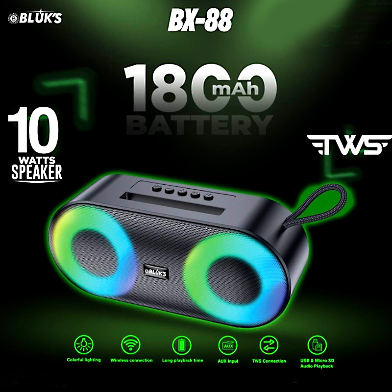 Turn up the volume and immerse yourself in rich, room-filling sound with the BLUK’S BX-88 Wireless Bluetooth Speaker.