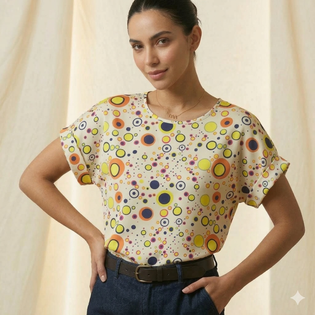 Brighten up your wardrobe with the LIVA Bubble Print Chiffon Blouse. This top features a dynamic and artistic geometric pattern, combining various sizes of circles and dots in a sunny color palette. The lightweight chiffon material drapes elegantly, offering a cool and airy feel that is ideal for warm weather or layered looks.