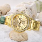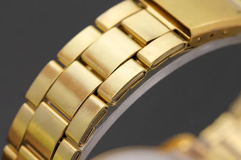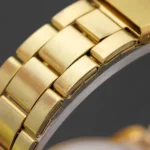 Design: Classic analog luxury watch with a high-polish gold finish.