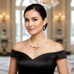 This exquisite set combines the timeless luster of artificial pearls with the brilliant sparkle of hand-set rhinestones, which are inlaid along flowing gold-tone curves to capture light from every angle.