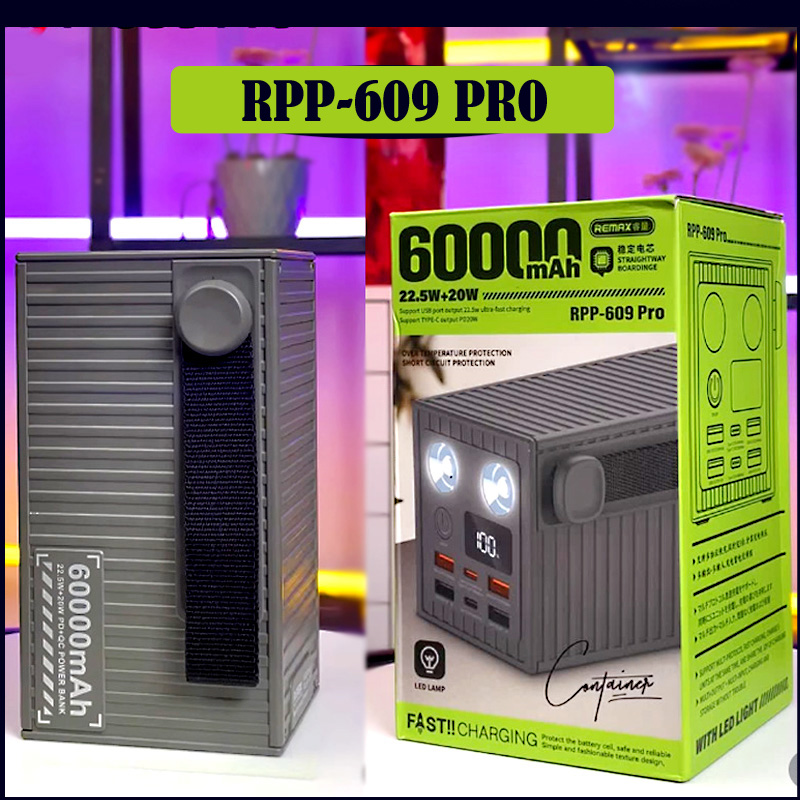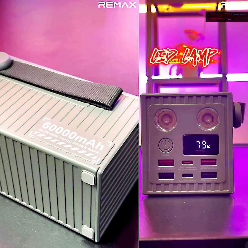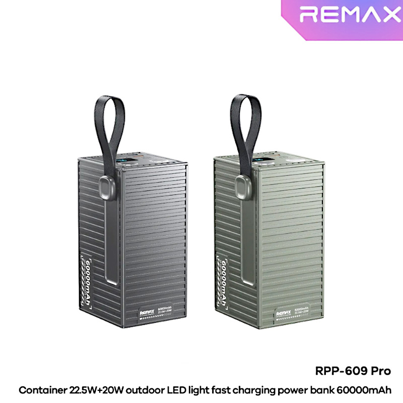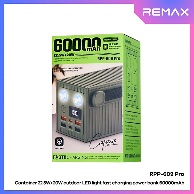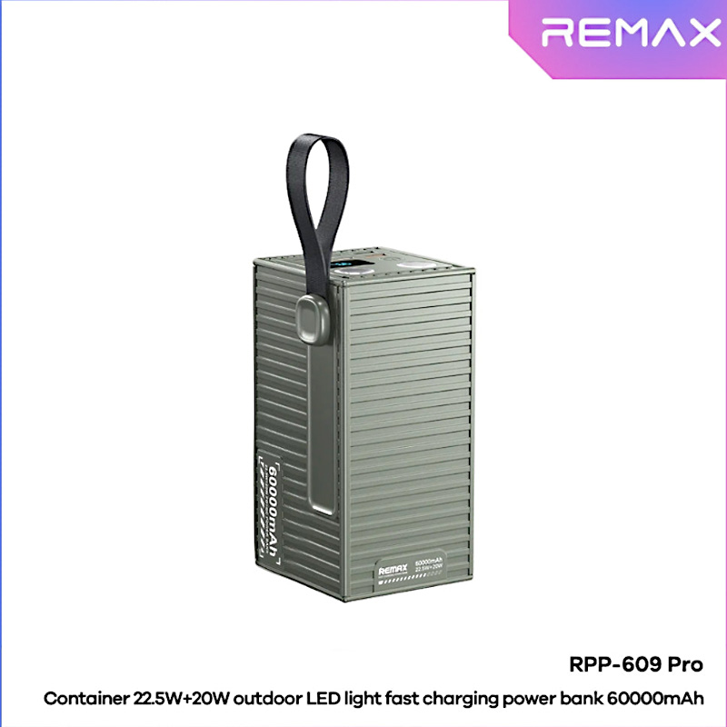 The REMAX RPP-609 Pro Container Series Power Bank is built for users who need reliable, high-capacity power anytime, anywhere. Featuring an enormous 60,000mAh battery, it is ideal for long trips, outdoor adventures, camping, and emergency backup during power outages.