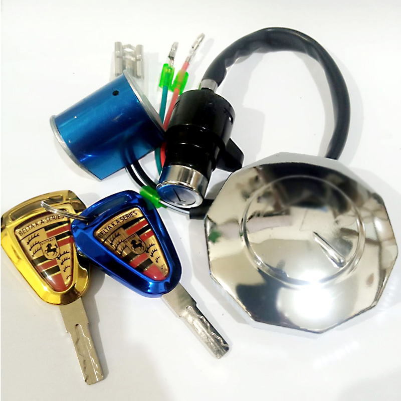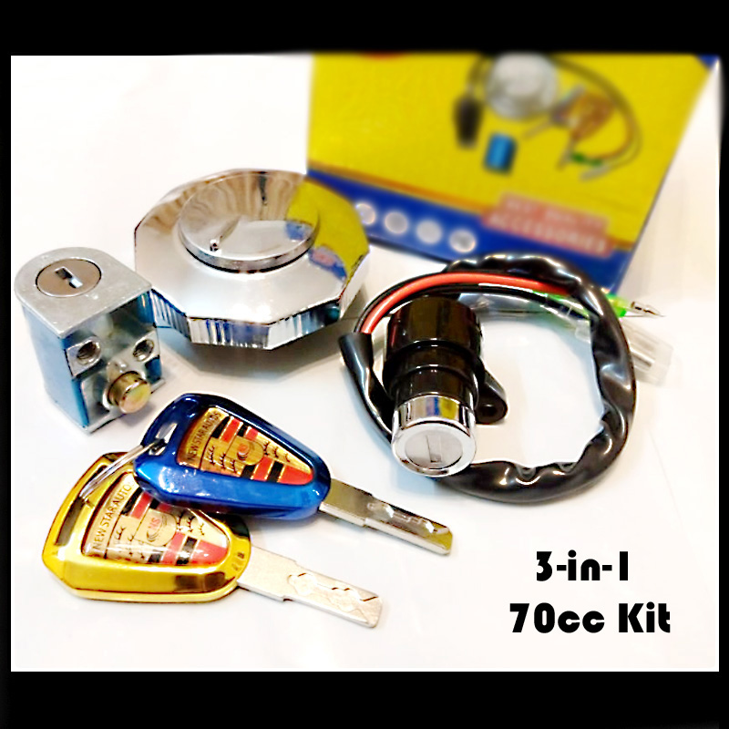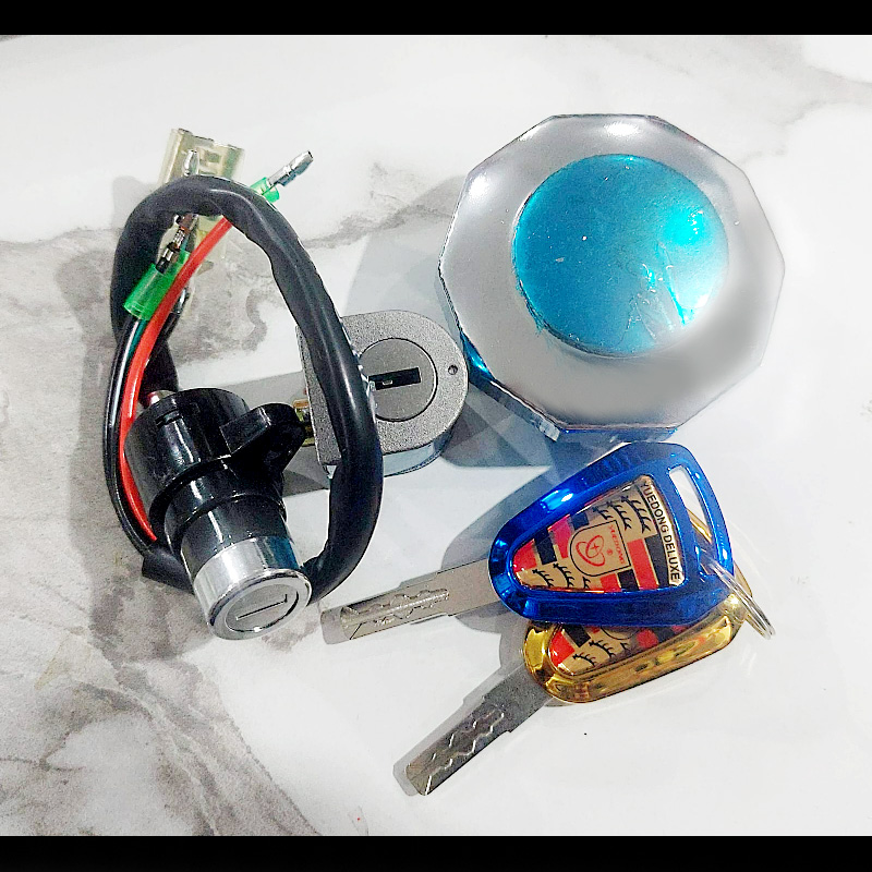 Enhance your motorcycle’s security and style with this Universal 3-in-1 Lock Set featuring Fancy Computerized Keys, specially designed for Honda CD70 and fully compatible with all 70cc China bikes. The set includes a reliable ignition switch with plug-and-play wiring, a chrome-finished fuel tank cap for secure petrol protection, and a durable handle/side lock for added anti-theft safety when parked.