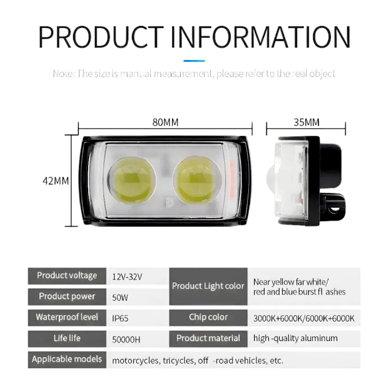 Built with a durable, high-quality aluminum body, it offers excellent heat dissipation and long-lasting performance with a lifespan of up to 50,000 hours. The waterproof IP65 design makes it reliable in all weather conditions, while the dual-lens projector technology enhances light focus and distance for safer rides. Its wide voltage compatibility (12V–32V) supports various vehicle types, and the universal mounting system allows for easy installation.