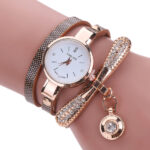 The highlight of this watch is its eye-catching multilayer teal leather strap, which wraps around the wrist like a stylish bracelet. To further enhance its elegance, the design includes a rhinestone-studded bar and a delicate dangling crystal charm that moves with you. Whether you are dressing up for a formal event or adding a chic touch to your casual outfit, this versatile watch is designed to make a statement.